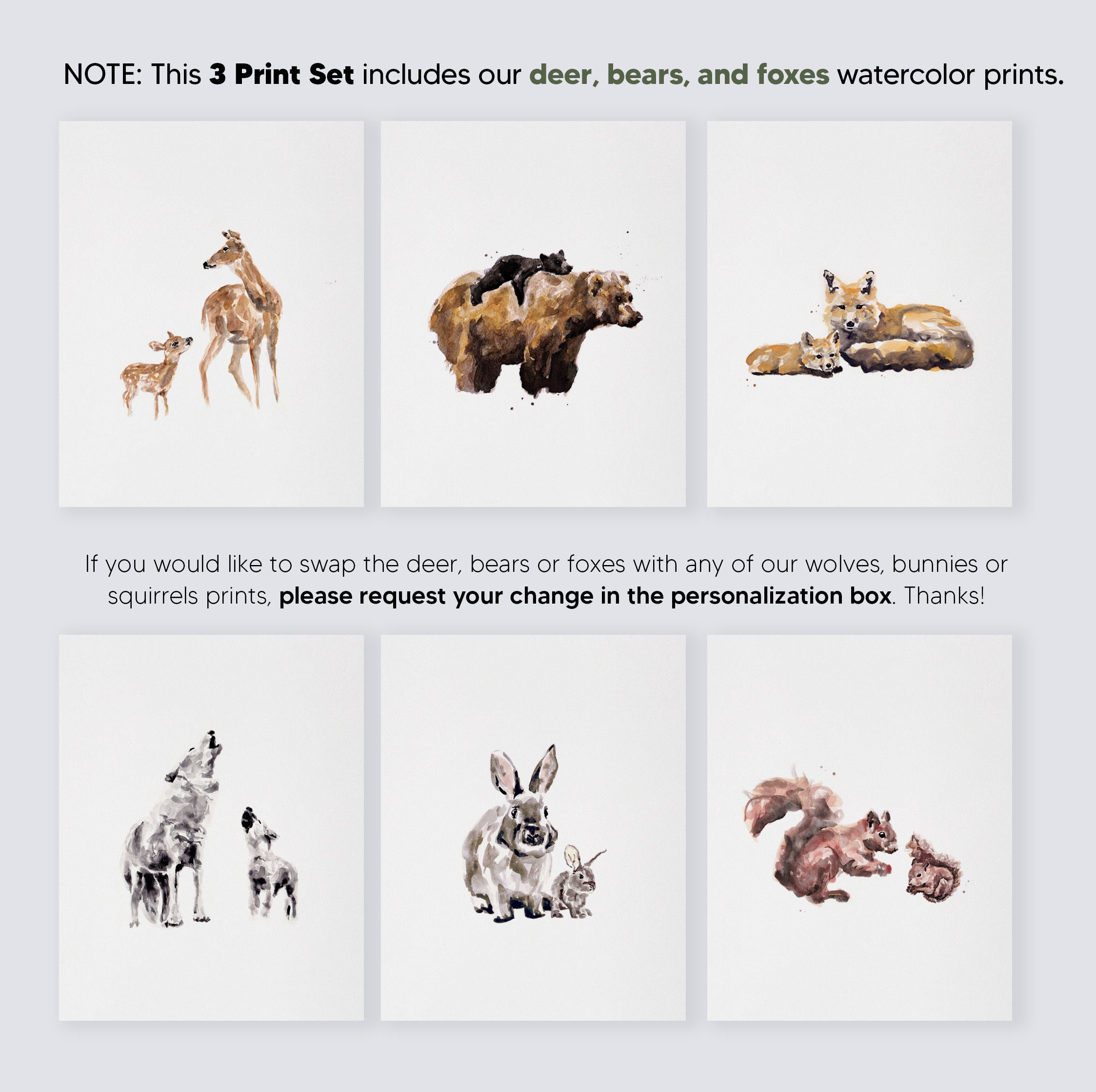 Woodland Nursery Prints Set of 3 Mom and Baby Bear Deer Fox Etsy